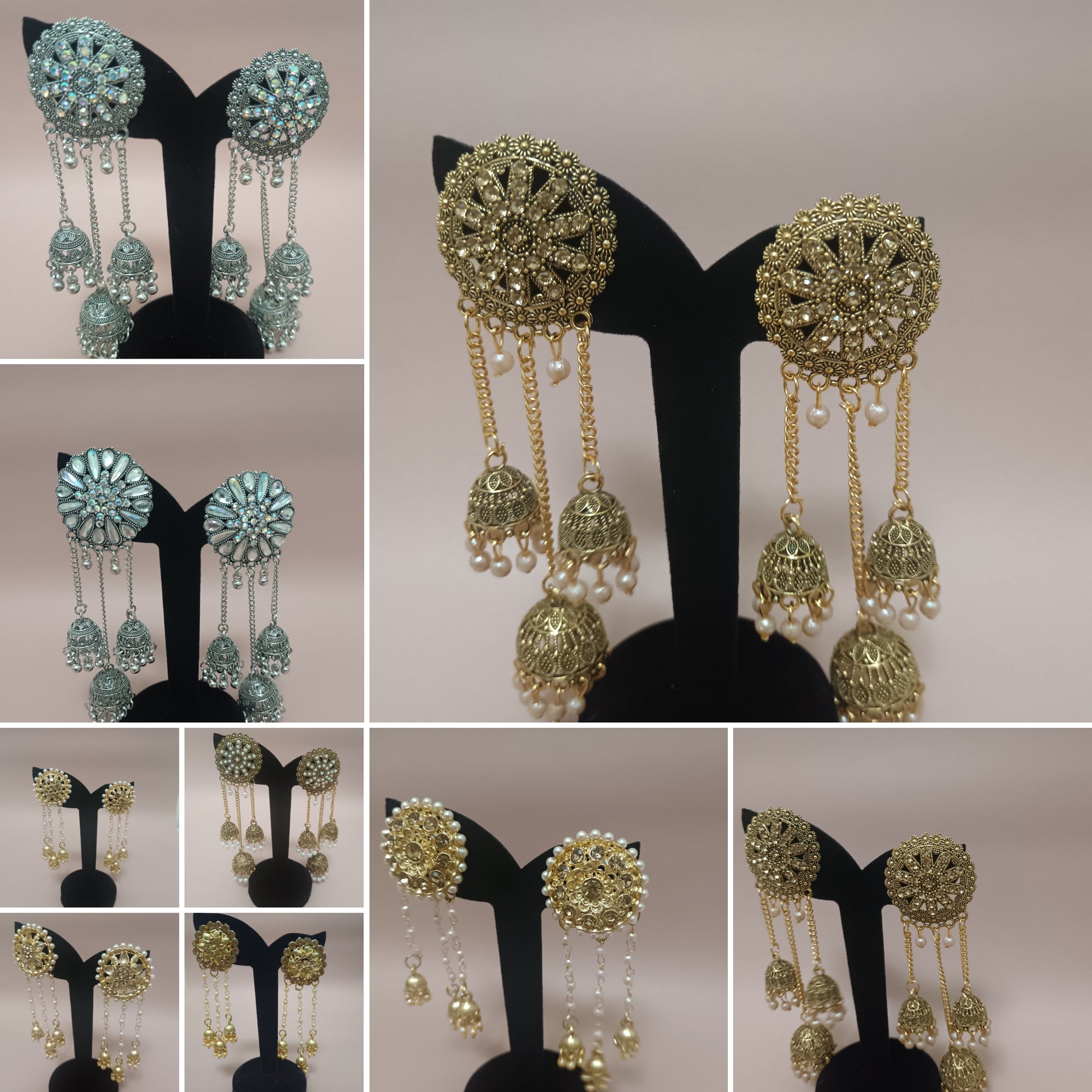 Elevate your jewellery collection with our versatile selection of gold and silver earrings, each piece adorned with lustrous pearls and sparkling stones. From elegant long styles to timeless designs, these earrings are crafted to complement traditional outfits and add a touch of sophistication to festive celebrations. Whether you're dressing for a special occasion or everyday elegance, find your perfect match from our curated range. Each style captures the essence of refined craftsmanship, making these earrings an essential addition to any jewellery box.