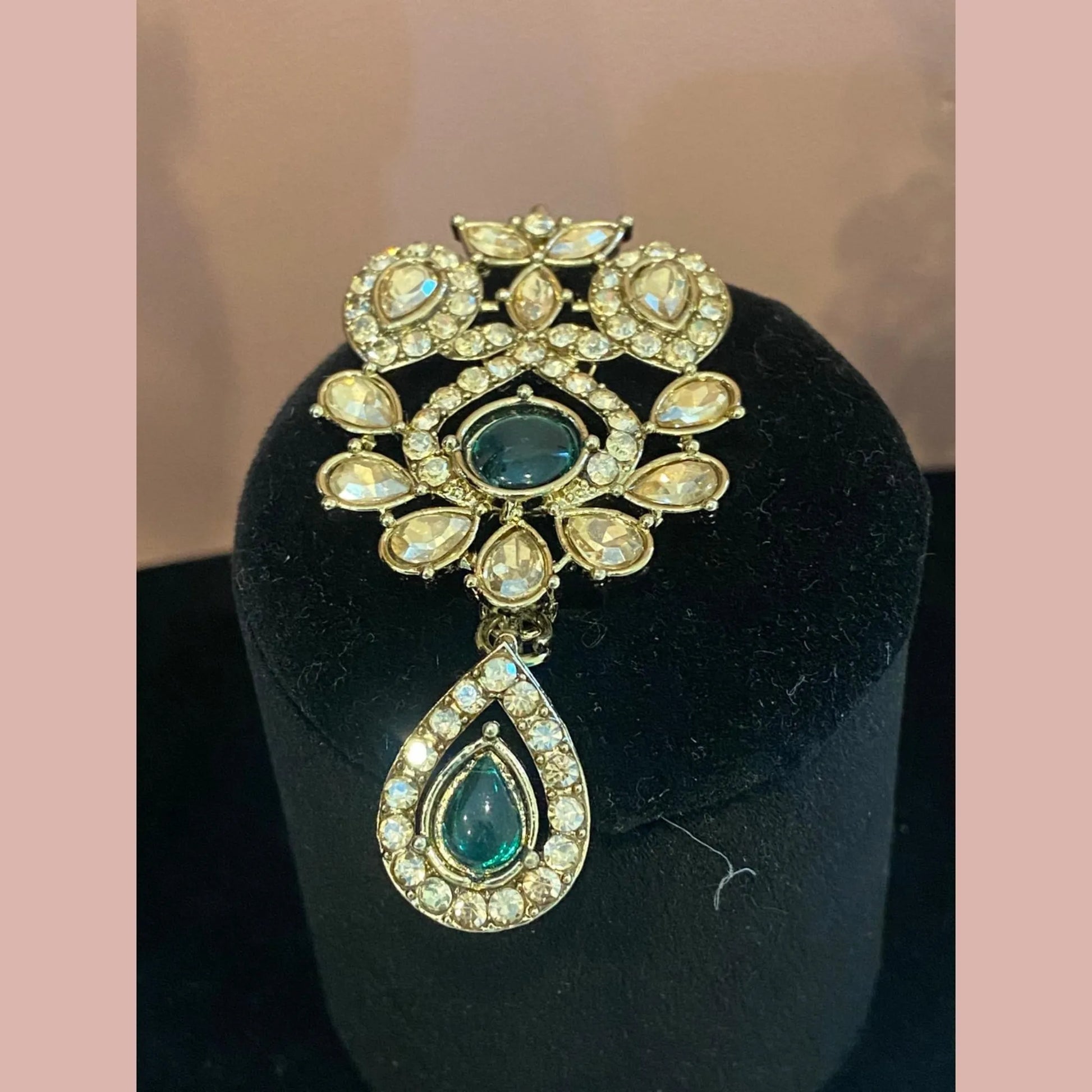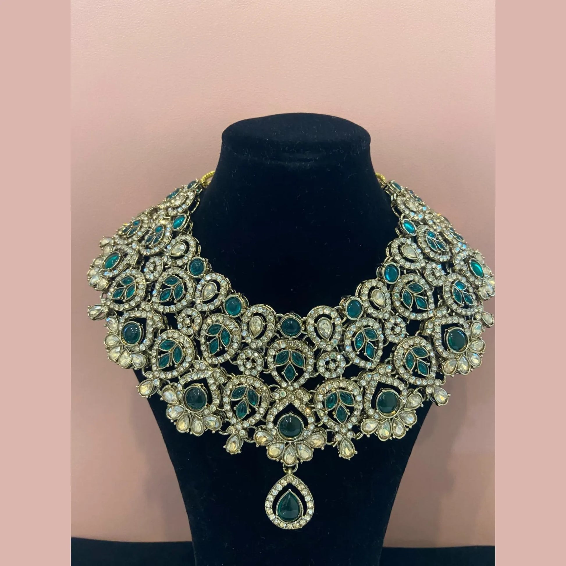 This stunning green emerald bridal set combines elegance with practicality for your special day. The collection features a coordinated necklace, matching earrings, and a traditional mang tikka, all crafted to make a bold statement. Despite its substantial weight, the pieces are thoughtfully designed for comfort during extended wear. A passa is included to complete your bridal jewellery ensemble. Perfect for weddings and celebrations, this set brings together timeless design with the rich beauty of emerald gemstones.