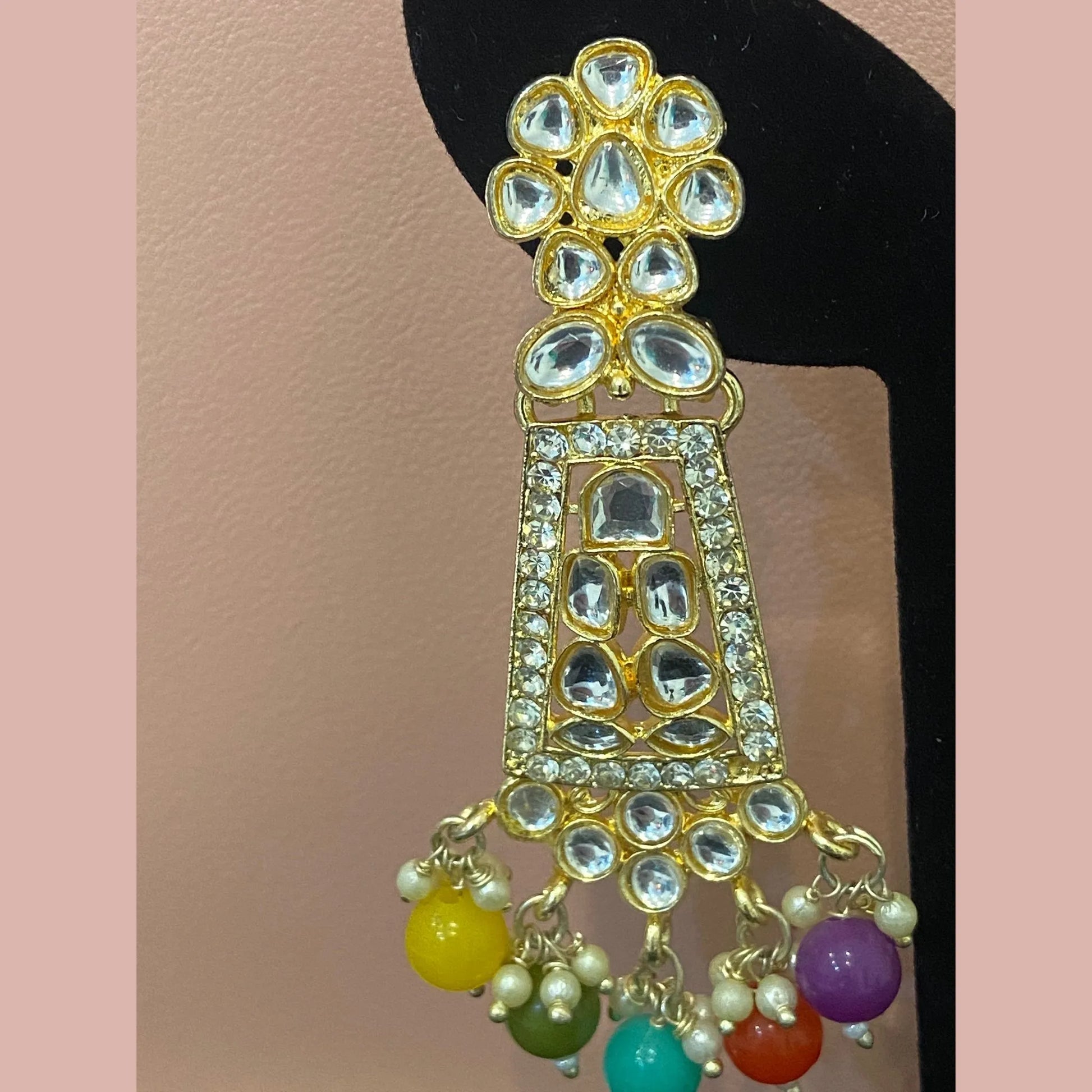 The matching earrings and maang tikka are finished with multicolor beads, creating a well-coordinated and eye-catching set. The mix of colours makes it easy to pair with different outfits, especially for weddings and festive occasions.
