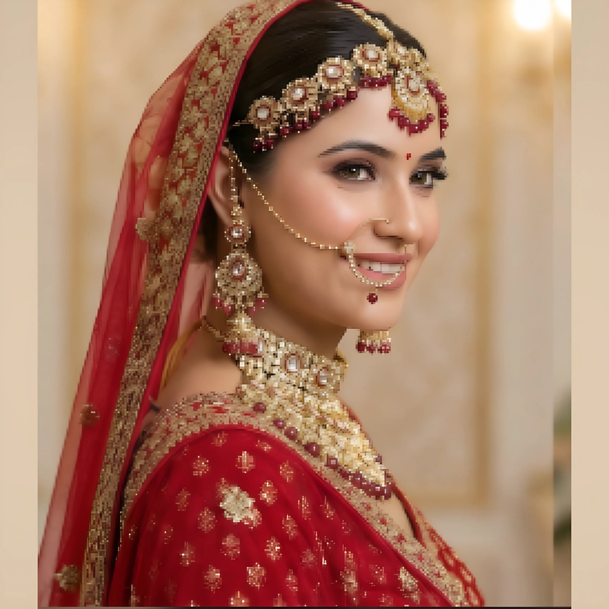 Make your big day even more special with this stunning traditional bridal jewellery set, designed to give a rich and elegant North Indian bridal look. This set features a beautifully detailed choker-style necklace paired with matching statement earrings, a graceful maatha patti, and a classic nath (nose ring with chain).